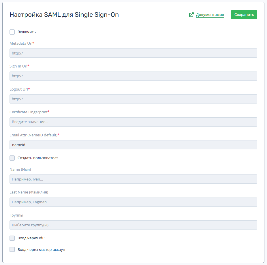 | Metadata Url | Адрес вашего IdP-сервера, указывающий на файл с мета-данными |