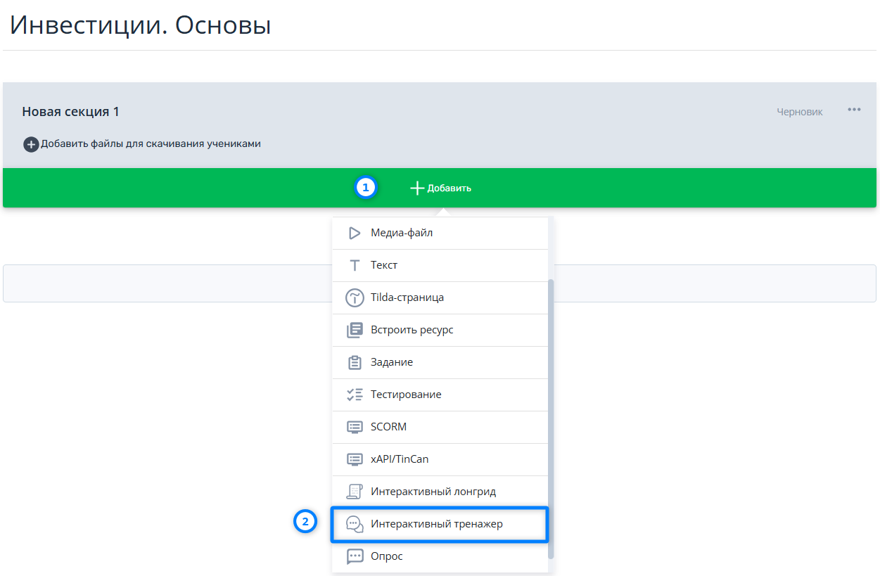 Для того чтобы создать интерактивный тренажер, перейдите в редактирование курса. Далее нажмите на кнопку "Добавить", после выберите "Диалоговый тренажер".