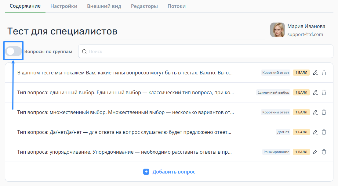 Любой тест, даже уже созданный, можно переключить в тип теста "Группы" и обратно в "Список". Чтобы создать или переключить уже созданный тест в режим использования группы вопросов, нажмите на тоггл "Вопросы по группам" (если тест уже был опубликован, потребуется создать новую версию - подробнее в разделе Версионирование):