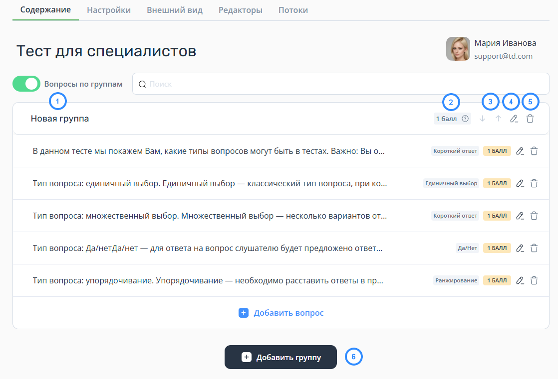 Возможность создавать группы и помещать в них вопросы тестирования предназначена для удобной группировки вопросов по вашим тематикам. К примеру, по сложности: простые, средние, сложные.