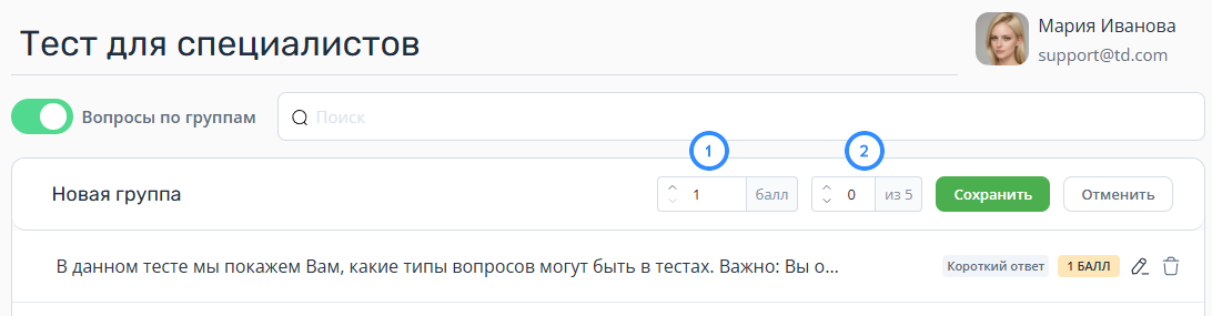 - Количество баллов. Корректировка количества баллов, которые будут начислены за каждый верный ответ, по каждому вопросу в этой группе.